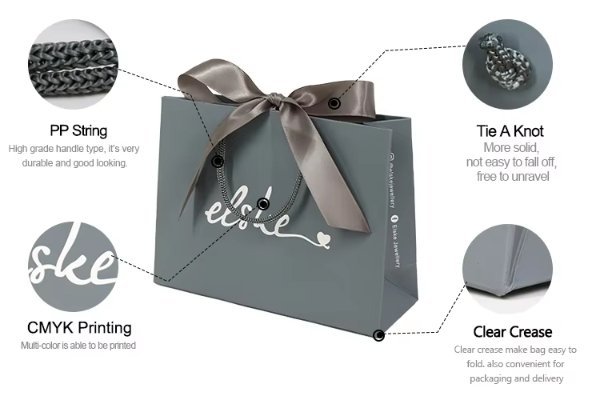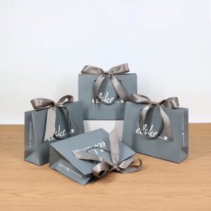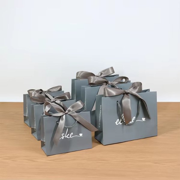 Customized Shopping Bag Jewelry Packaging Grey Cardboard Thick Soft Touch Paper Bag With Bow Ribbon